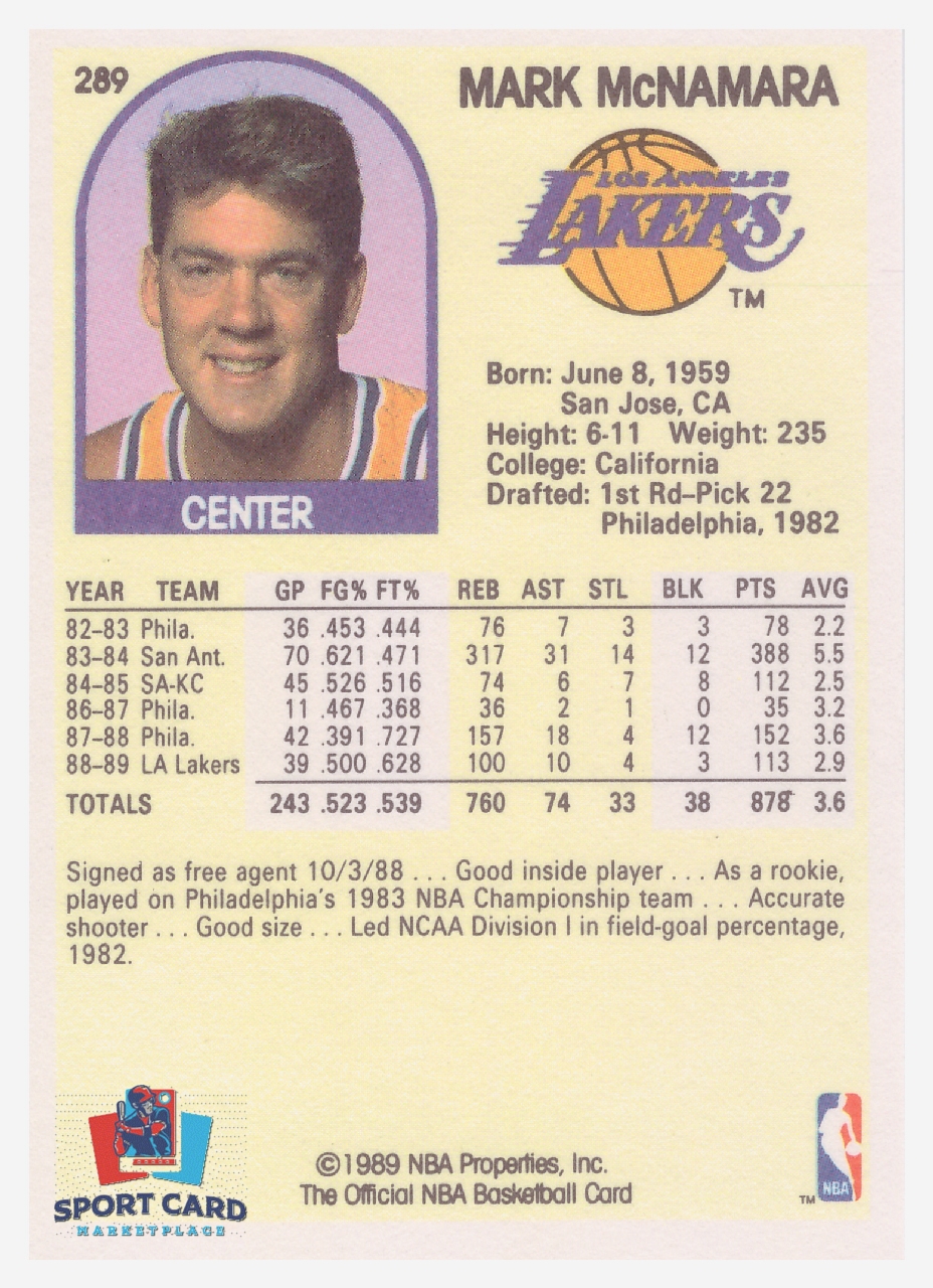 1989-90 NBA Hoops #289 Mark McNamara / Los Angeles Lakers
