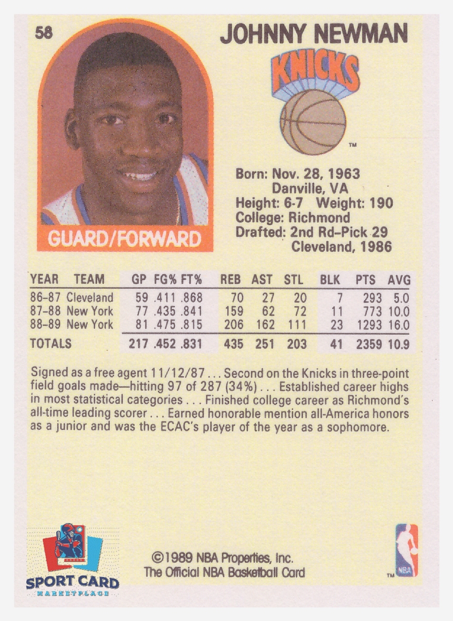 1989-90 NBA Hoops #58 Johnny Newman / New York Knicks