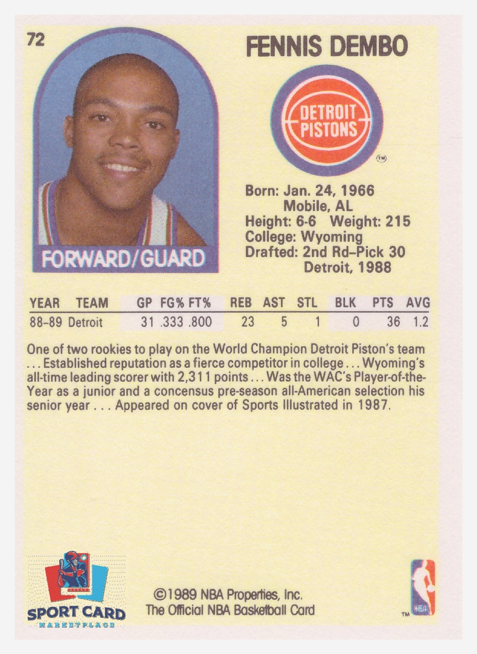 1989-90 NBA Hoops #72 Fennis Dembo / Detroit Pistons