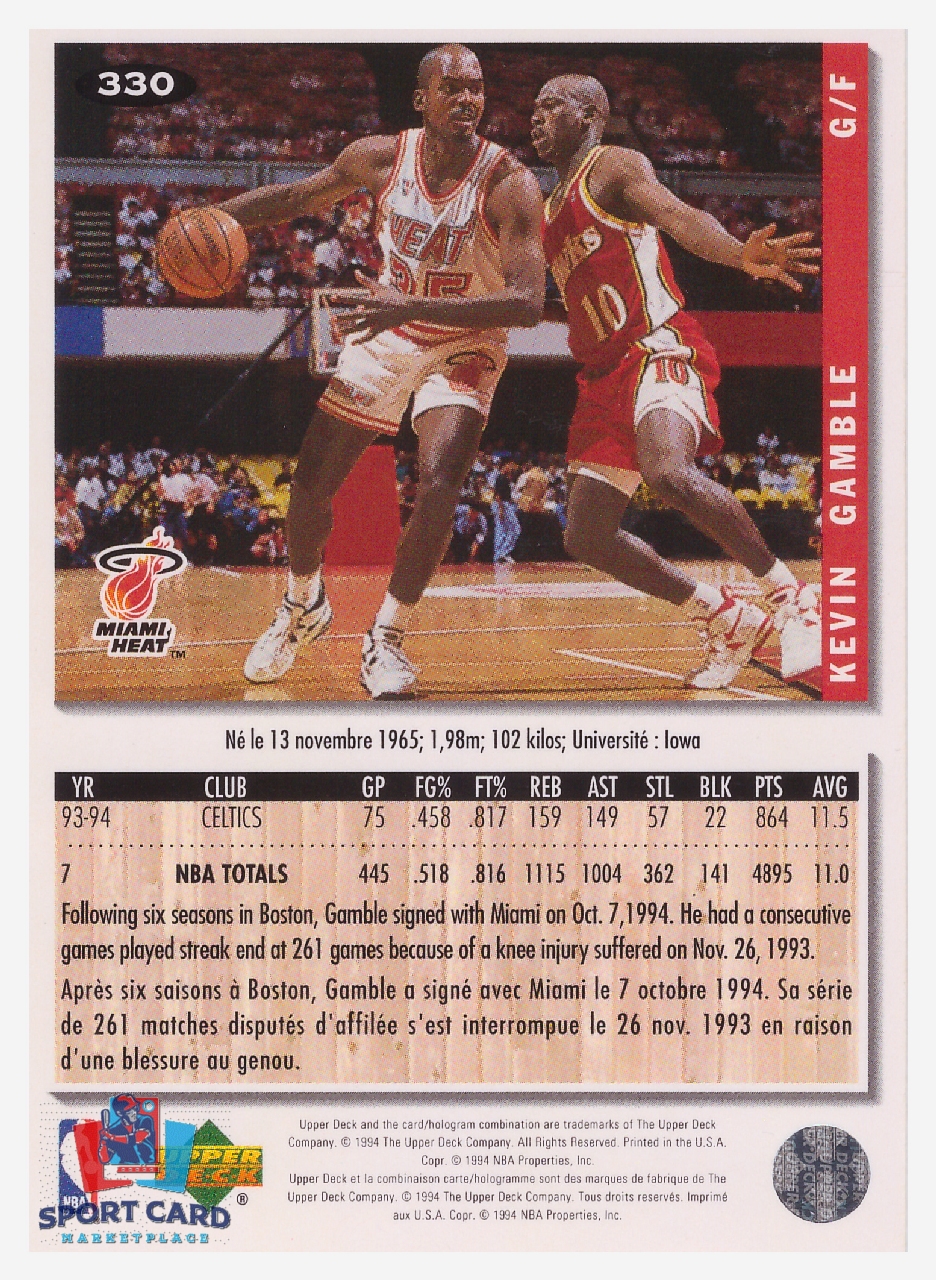 1994 Upper Deck Collector’s Choice Kevin Gamble / Miami Heat #330