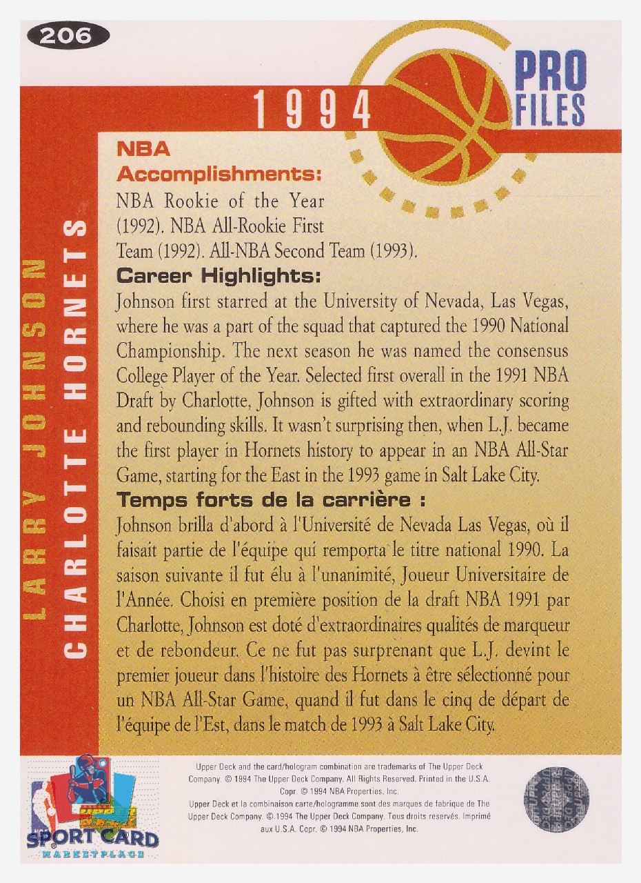 1994 Upper Deck Collector’s Choice – Pro Files Larry Johnson / Charlotte Hornets #206